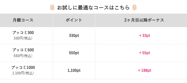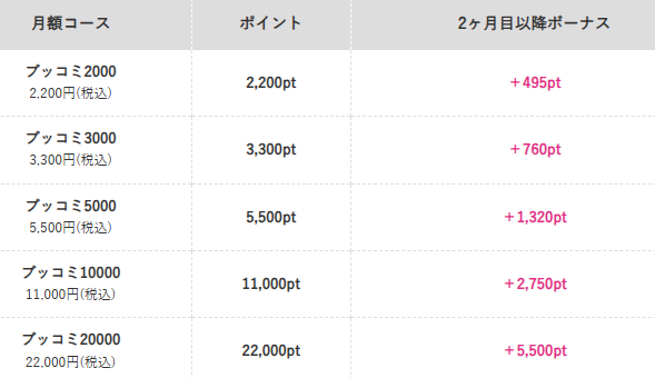 ブッコミの月額コースなら、毎月支払った金額以上の「ポイント」が受け取れます。