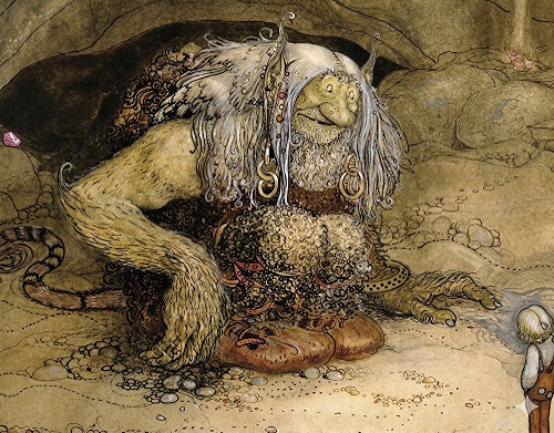 トロールは、山や深い森に棲む巨人のような妖精で、知能は低く醜悪で乱暴な存在として描かれることが多いようです。